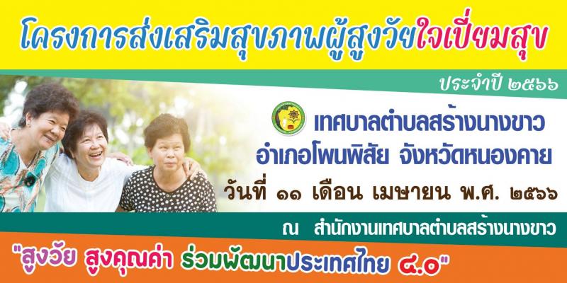 รายละเอียด : สูงวัย สูงคุณค่า ร่วมพัฒนาประเทศไทย ๕.๐ โครการส่งเสริมสุขภาพผู้สูงอายุ ใจเปี่ยมสุข ประจำปี ๒๕๖๖ วันที่ ๑๑ เดือน เมษายน พ.ศ ๒๕๖๖ ณ สำนักงานเทศบาลตำบลสร้างนางขาว อ.โพนพิสัย จ.หนองคาย