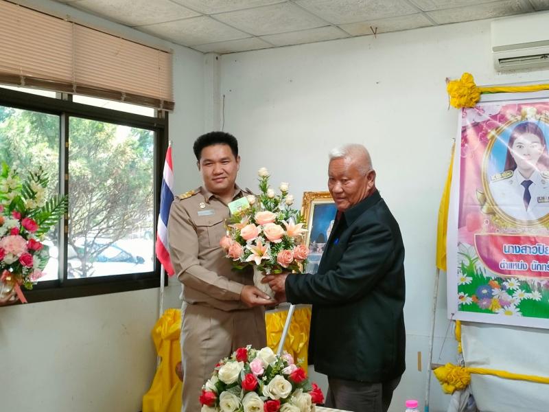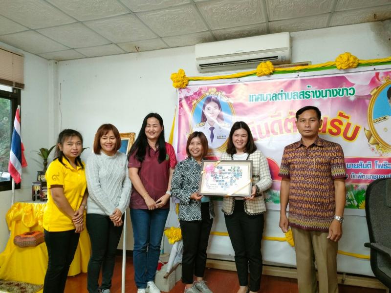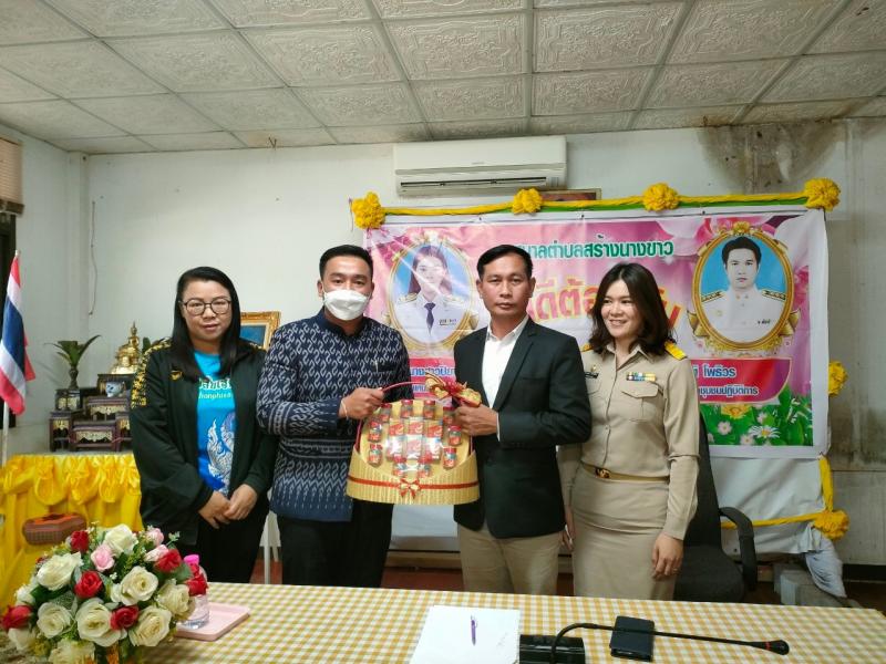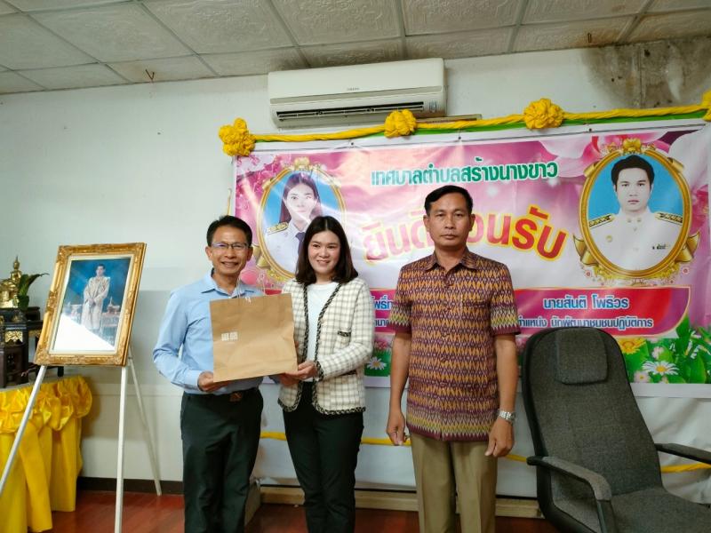 นายไหล่ จะหลาบหลวง นายกเทศมนตรีตำบลสร้างนางขาว กล่าวต้อนรับและแสดงความยินดี นายสันติ โพธิวร ตำเเหน่ง นักพัฒนาชุมชนปฏิบัติการ เเละ นางสาวปิยาภรณ์ ลิมโพธิ์ทอง ตำเเหน่งนักทรัยากรบุคคลชำนาญการ ที่เดินทางมาบรรจุ