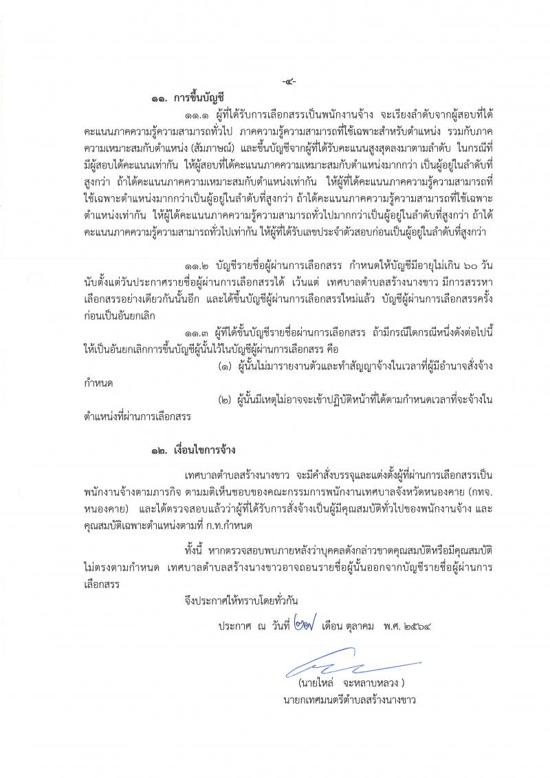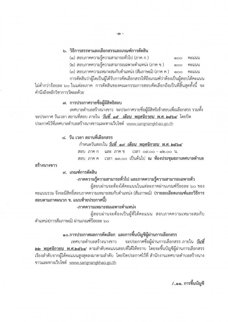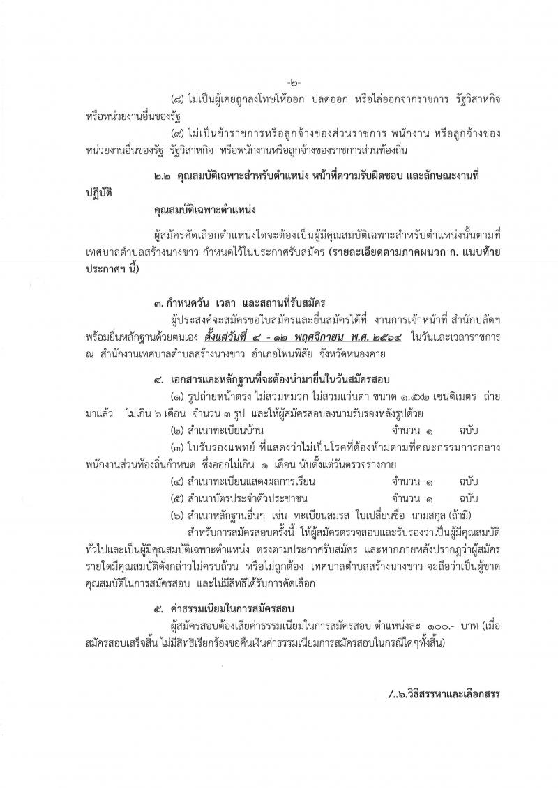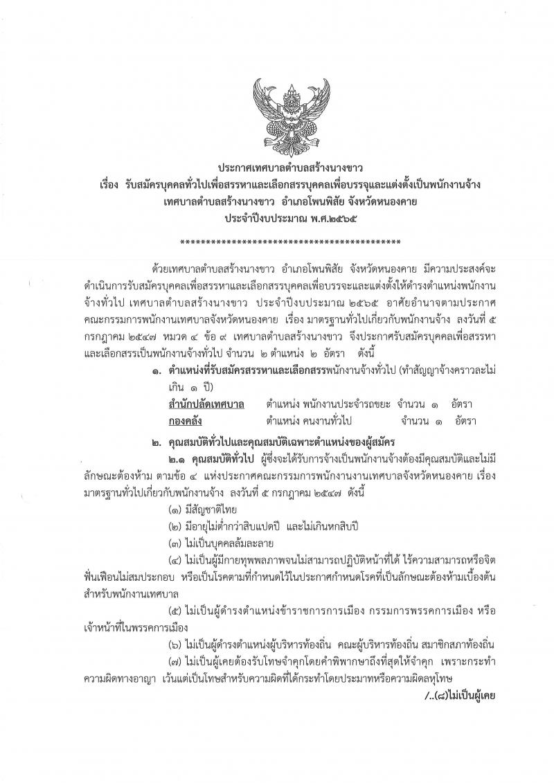 รายละเอียด : ด้วยเทศบาลตำบลสร้างนางขาว มีความประสงค์จะดำเนินการรับสมัครบุคคลที่มีความรู้ความสามารถในการบริการประชาชน และการทำงานของเทศบาลตำบลสร้างนางขาว ให้มีประสิทธิภาพและประสิทธิผลเพื่อสรรหาและเลือกสรรบุคคลเพื่อบรรจุและแต่งตั้งให้ดำรงตำแหน่งพนักงานจ้างทั่วไป โดยจะเปิดรับสอบคัดเลือกเพื่อบรรจุและแต่งตั้งบุคคลเป็นพนักงานจ้างทั่วไป จำนวน 2 ตำแหน่ง 2 อัตรา ในระหว่างวันที่ 4 - 12 พฤศจิกายน 2564 ในวันและเวลาราชการ และดำเนินการสรรหาในวันที่ 19 พฤศจิกายน 2564
